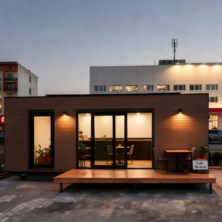 - Wandaufbau: Innen- und Außenverkleidung mit 100 mm PIR-Dämmung, Hochwertige Fassadenverkleidung aus Trapezblech in Holzoptik, U-Wert: 0,21 W/m²K