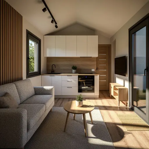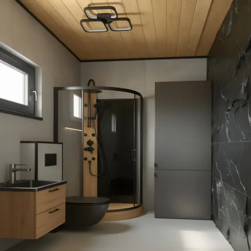 - Badezimmer – Premium-Version: Duschkabine 90 × 90 cm, Wandhängendes WC, Verkleidete Wände in verschiedenen Optiken (Holzoptik, Steinoptik), Großes Waschbecken mit Unterschrank und LED-Spiegel, Elektrischer Heizkörper, 60 Liter SLIM Boiler