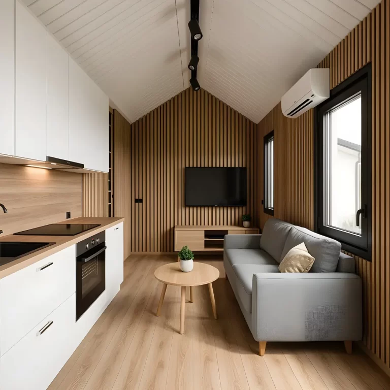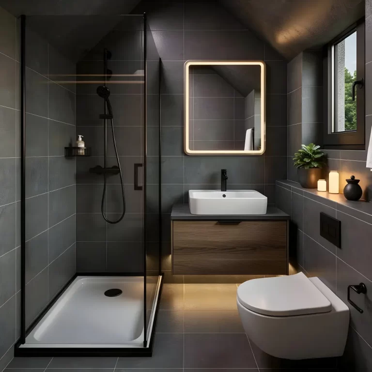 - Badezimmer – Premium-Version: Duschkabine 90 × 90 cm, Wandhängendes WC, Verkleidete Wände in verschiedenen Optiken (Holzoptik, Steinoptik), Großes Waschbecken mit Unterschrank und LED-Spiegel, Elektrischer Heizkörper, 60 Liter SLIM Boiler