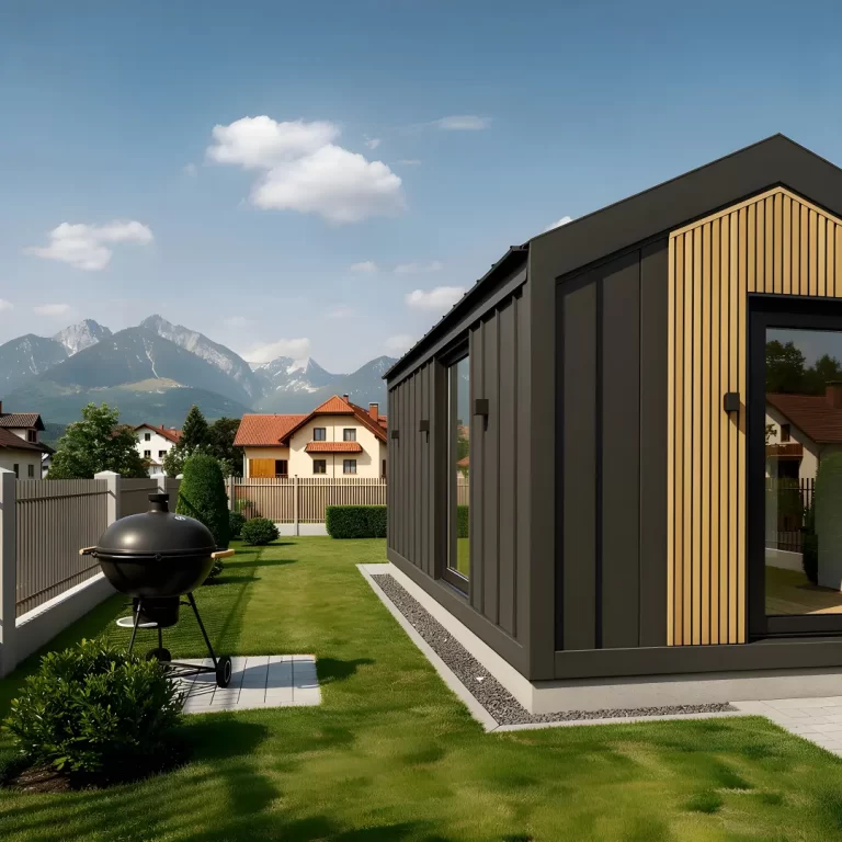 - Wandaufbau: Innen- und Außenverkleidung mit 100 mm PIR-Dämmung. Hochwertige Fassadenverkleidung aus Trapezblech in Holzoptik. U-Wert: 0,21 W/m²K
